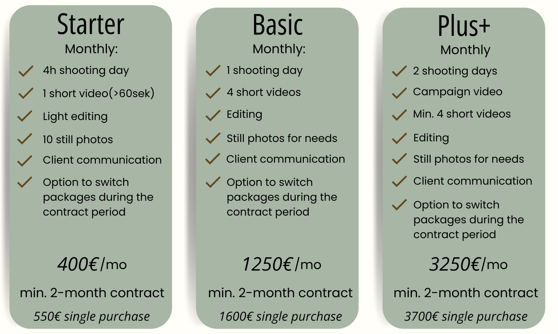 With our package solutions, you can easily switch between plans - for example, start with the Basic package and move to the Plus+ package during months when you need a longer campaign video.