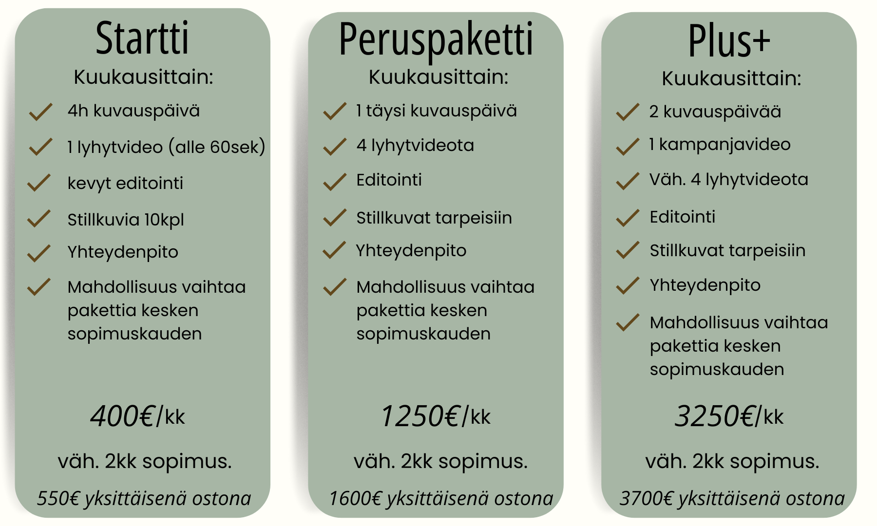 Pakettiratkaisuissa voitte joustavasti vaihtaa pakettien välillä - esimerkiksi aloittaa peruspaketilla ja siirtyä Plus+ pakettiin kuukausina, mikäli teillä on tarve pidemmälle kampanjavideolle.
