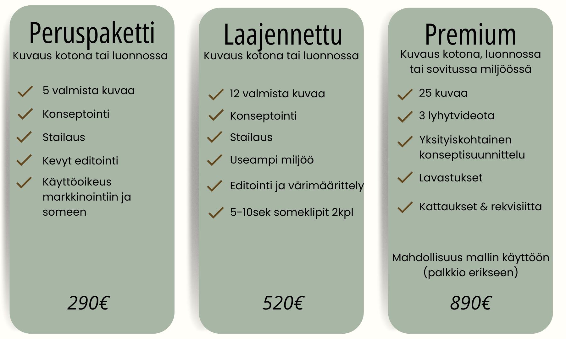 Tarjoamme yrityksille laadukkaita ja tunnelmallisia miljöökuvia tuotteista. Voitte toimittaa tuotteet meille, ja suunnittelemme niille konseptin, joka tukee brändiänne ja näyttää tuotteet aidossa käytössä.